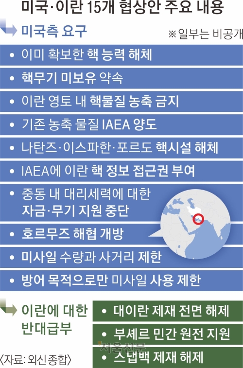 호르무즈 해협 개방과 미사일 사거리·규모 제한 등도 담겼지만, 대부분 요구사항은 이란 핵능력 무력화와 관련됐다. 또 이란이 이러한 조건을 수용한다면 미국은 국제사회가 그간 이란에 부과한 제재를 전면 해제하고, 이란 부셰르 원자력발전소 전력 생산을 포함한 민간 원자력 프로그램을 지원하는 ‘당근책’도 담겼다.