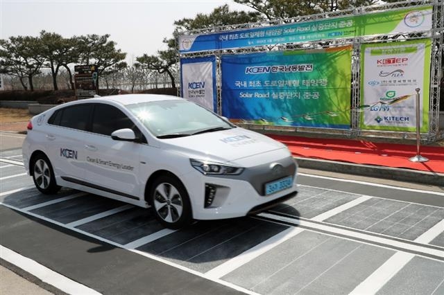 인천 영흥에너지파크 진입 도로에 설치된 도로 일체형 태양광 모듈 위를 업무용 전기차가 주행하고 있다.