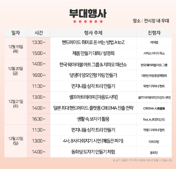 먼저 부대행사에는 색다른 핸드메이드를 즐길 수 있는 각종 세미나, 시연, 체험 등이 준비됐다. 특히 부대행사장에서는 핸드메이드 강국인 일본의 최대 핸드메이드 플랫폼 ‘Creema‘의 오오하시 유키 이사가 진행하는 특별 강연이 펼쳐진다.
