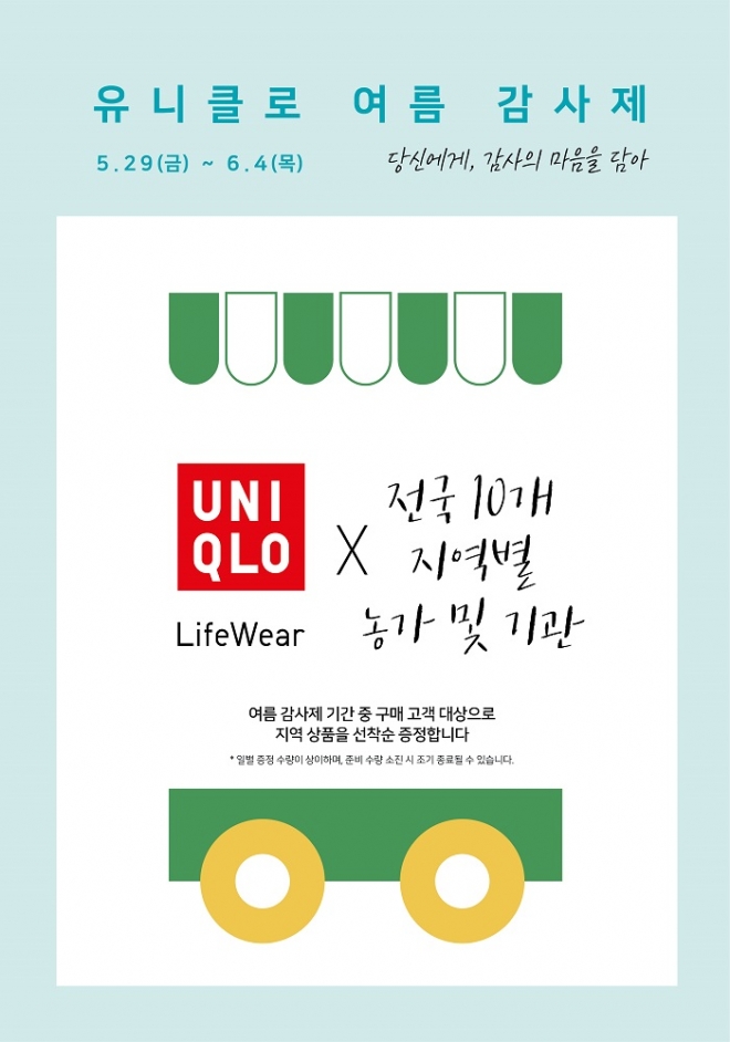 유니클로 관계자는 “유니클로는 뛰어난 품질과 디자인, 합리적인 가격의 ‘라이프웨어’ 제품을 선보이는 것뿐만 아니라, 매장이 위치한 해당 지역사회에 기여하고, 지역 내 고객의 목소리에 귀 기울이는 것을 중요하게 생각하고 있다”라며 “이번 감사제에서도 소비자뿐만 아니라 지역사회에 실질적인 도움이 될 수 있는 프로모션을 진행하기 위해 각 매장의 점장들과 직원들의 주도 아래 다양한 지역 특산품 증정 이벤트를 준비하게 됐다”라고 전했다.