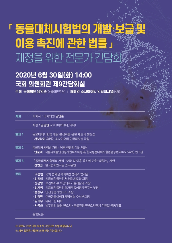 간담회 발제는 휴메인 소사이어티 인터내셔널 서보라미 국장이 ‘동물대체시험 활성화 위한 제도의 필요성’, 식품의약품안전평가원 한국동물대체시험법검증센터(KoCVAM) 안준익 연구관이 동물대체시험법 개발·이용 현황과 개선 방향’, 한국법제연구원 장민선 연구위원이 ‘동물대체시험법의 개발·보급 및 이용 촉진에 관한 법률안 제안’을 발표한다.