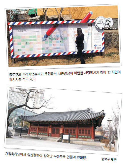 구는 우정사업본부와 함께 지난 1월30일 우리나라 우편사업의 출발지인 우정총국 시민광장에 사랑메시지 창을 설치하고 누구나 자유롭게 엽서를 쓰고 전시할 수 있는 공간을 운영하고 있다. 사랑메시지 창은 문자메시지나 이메일 대신 엽서를 주고받던 옛 정감을 되살려 손으로 쓴 엽서를 통해 순수한 마음을 전하자는 취지로 만들어졌다. 가로 4m, 높이 2m 크기에 펜과 엽서를 디자인한 독특한 모습으로 만들어진 사랑메시지 창에는 총183매의 크고 작은 엽서를 부착할 수 있으며 지금까지 내·외국인이 작성한 엽서 900여장이 전시됐다.