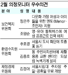서울신문과 서울시의회가 함께하는 2월 의정모니터 회의에서는 모니터 요원들이 올린 의견 129건 가운데 심사를 거쳐 우수 의견 5건을 선정했다. 우수 의견에는 ‘다문화 가정 여성과 아이들을 위한 멘토(Mentor·조언자) 지원’과 ‘영·유아 통학버스에 여성 공공근로 인력 배치’, ‘서울시 도시 화단에 토종꽃 심기’, ‘동 주민자치센터에 재활용품 교환 센터인 되살림 녹색가게 설치’, ‘서울시립대 주차장 주말·공휴일 무료 개방’ 등 보건복지·환경·재경 분야 의견이 선정됐다.