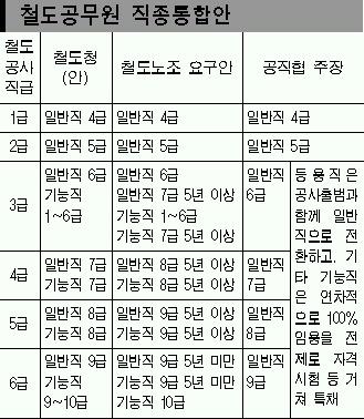 공사는 현행 10급이 아닌 6급 체계로 바뀐다. 철도청은 현 기능직급을 그대로 반영할 계획인 것으로 알려졌다. 이 경우 기능7급은 근속경력에 상관없이 4급 1년차로 전환된다. 노조는 이를 일반직 중심의 통합방식이라며 반발하고 있다.