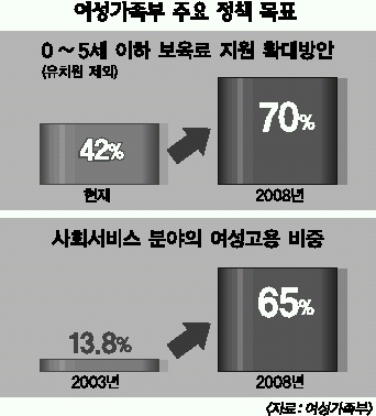 장 장관은 여성들의 일자리 창출과 가족정책도 주요 과제로 들었다. 그는 “2만달러 시대로 가려면 결국 노동시장이 더 커져야 하는데 새로 노동시장이 추가될 곳이라고는 여성밖에 없다.”면서 “무엇보다 여성 인력을 고급화해 사회서비스 분야의 여성 고용 비중을 오는 2008년까지 65%로 끌어올리겠다.”고 강조했다. 여성들의 경제활동 참여와 직결되는 보육료 지원과 관련해서는 “지난해 4000억원에 불과한 보육 예산을 50% 올려 올해 6000억원을 확보했지만 앞으로 최소 두 배 이상은 늘려야 할 것”으로 전망했다.