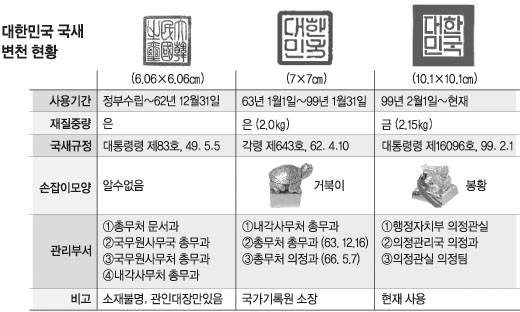 행정자치부는 24일 “1999년 2월부터 사용 중인 국새에 인뉴(손잡이)와 인문(글자체)사이 3곳 7㎝, 글자체에 2곳 등 모두 5곳에서 균열이 생겼다.”며 “국가의 상징인 국새의 균열이 확인된 만큼 더 이상 사용하는 것이 곤란하다고 판단해 새로 만들기로 했다.”고 밝혔다. 현행 국새는 1998년 정부수립 50주년을 맞아 제작돼 1999년 2월부터 사용됐다. 제작된 지 7년여 만에 ‘균열’로 판정돼 다시 제작하는 것이다. 이에 따라 부실 제작에 따른 책임론도 부각되고 있다.