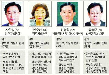 강신욱·이규홍·이강국·손지열·박재윤 대법관이 다음달 10일 퇴임하고 신임 대법관들은 다음달 11일 취임,6년간의 임기를 시작한다.
