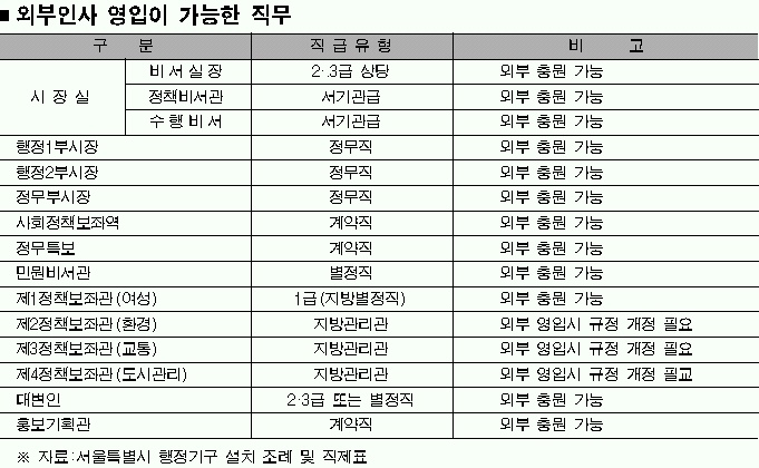 하지만 서울시 안팎에선 “누가 부시장이 된다.”는 인사 하마평이 벌써 무성하다. 서울시 정무직 고위간부는 7∼15개 정도다. 물론 조직개편을 어떻게 하느냐에 따라 그 폭은 줄거나 늘 수도 있다.