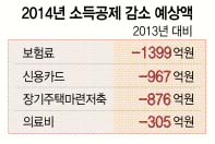 내년에는 유리지갑 근로자들의 ‘13월의 보너스’라고 불리는 연말정산 소득공제 혜택도 대폭 줄어든다. 기재부에 따르면 소득공제 금액은 올해 10조 1345억원에서 내년에는 9조 8629억원으로 2716억원가량 축소된다. 올해부터 신용카드 사용액 소득공제율이 20%에서 15%로 줄어들어 내년에 환급받는 신용카드 소득공제액이 올해보다 967억원 감소한다. 보험료와 의료비 공제금액도 각각 1399억원, 305억원 줄어들고 장기주택마련저축 소득공제(876억원) 제도는 아예 폐지된다.