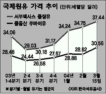 지난 15일 현지에서 거래된 중동산 두바이유 현물가격은 보름전인 1일보다 1.94달러 오른 배럴당 30.56달러를 기록했다.미 서부텍사스 중질유(WTI)도 2.68달러 오른 37.44달러,북해산 브렌트유 역시 2.82달러 오른 33.51달러에 거래됐다.지난해 평균유가와 비교하면 3.77∼6.32달러 오른 셈이다.국내 도입원유의 80%를 의존하고 있는 중동산 원유인 두바이유는 지난 1일 30달러선을 13개월 만에 돌파한 뒤 좀처럼 내려오지 않고 있다.