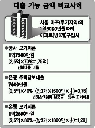 -아파트를 담보로 대출받는 경우는 모기지론이 단연 유리하다.시중은행은 대출금을 산정할 때 방 개수에 비례해 소액 임차보증금을 공제하는 반면 모기지론은 공제하지 않기 때문이다.똑같은 조건이라도 최고 2배(예시 참조)까지 대출금이 차이난다.