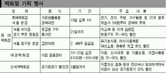 백화점들이 매출액을 늘리기 위해 올인하고 있다.경매 행사를 열거나 벼룩시장·알뜰장터를 개설하는가 하면,반품이나 하자상품 등 중고품을 판매하고 진단서를 첨부하면 할인해 주는 등 소비자들의 관심을 끌 수 있는 일이라면 ‘물불을 가리지 않는’ 총력전을 펼치고 있다.