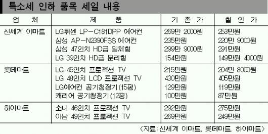 신세계 이마트는 이날부터 에어컨·프로젝션 TV 등 특소세 인하 제품에 대해 정부의 인하율보다 0.2∼1%포인트 더 내린 가격에 선보인다.LG휘센 LP-C181DPP(269만 2000원)는 253만원,삼성 47인치 HD급 일체형(299만원) 291만원,LG39인치 HD급 분리형(154만원)은 149만 4000원에 내놓았다.