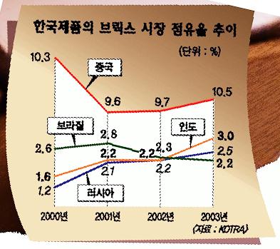 국내 업체들의 브릭스 국가 진출이 가속화하면서 1999년 169억달러였던 이들 4개국에 대한 수출액은 2002년 274억달러로 크게 증가했다.2006년에는 750억달러에 이를 것으로 추정된다.