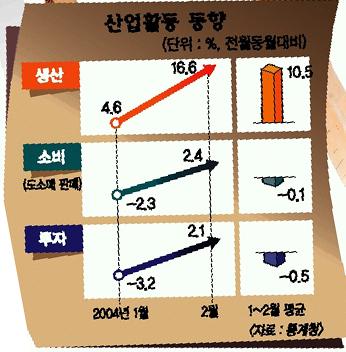 생산·소비·투자가 2월에 일제히 상승세로 돌아선 것은 전적으로 ‘수출의 힘’이다.40%가 넘는 경이적 수출 증가율이 생산 출하량을 늘리고,기업들의 설비투자를 끌어냈다.재고 증가율(5.0%)도 1월보다는 늘었지만 10% 안팎을 오가던 지난해 중반과 비교하면 크게 부담이 줄었다.설 효과도 톡톡히 봤다.지난해 2월에 끼어있던 설이 올해는 1월로 옮겨가는 바람에 올 2월의 조업가능일수가 하루 늘어난 것이다.소비와 생산은 ‘하루’ 차이에도 크게 움직인다.