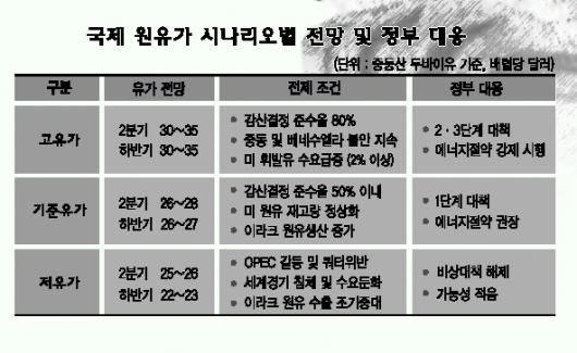 고유가도 기업의 채산성에 큰 악재다.제품값을 올려야 하지만 내수침체 상황에서는 유가 상승분을 기업체가 떠안을 수밖에 없다.그렇지 않고 소비자 부담으로 이어지면 임금상승 압력으로 작용한다.고유가·환율하락이 지속되면 경제성장 속도의 둔화는 불가피하다.정부는 석유비수기인 2·4분기에 접어들었으나 중동산 두바이유는 배럴당 26∼28달러의 고유가를 유지할 것으로 전망하고 있다.하반기에는 26∼27달러로 예상한다.이날 두바이유가 배럴당 31.13달러에 거래된 것에 비하면 현재보다 3∼4달러쯤 낮아질 것이라는 낙관적인 견해다.산자부는 세계경기 침체로 원유 수요가 둔화되면 배럴당 25달러까지 떨어질 가능성도 배제하지 않고 있다.중동 및 베네수엘라의 불안감이 지속되고 감산결정 이행률이 80%를 넘으면 35달러에 육박할 수도 있으나 그 가능성은 낮다고 본다.