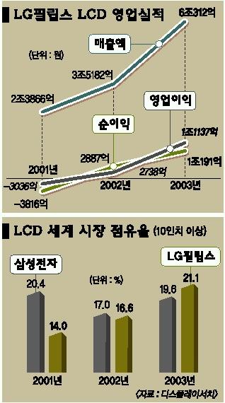 출범 직후인 2000년 10인치 이상 대형 LCD시장에서 점유율 14%로 삼성전자 20.4%에 이어 2위를 기록한 뒤 격차를 좁혀나가다 지난해 21.1%로 1위에 오르면서 삼성전자를 따돌리는 데 성공했다.