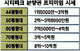 국세청은 20일 시티파크 아파트의 분양권 프리미엄 시세는 최고 10억원까지 붙었다고 밝혔다.평형별로는 ▲44평형대 1억 5000만∼3억원 ▲50평형대 2억∼3억 6000만원 ▲60평형대 2억 5000만∼4억원 ▲70평형대 3억∼5억원 ▲90평형대(팬트하우스) 8억∼10억원 등이다.