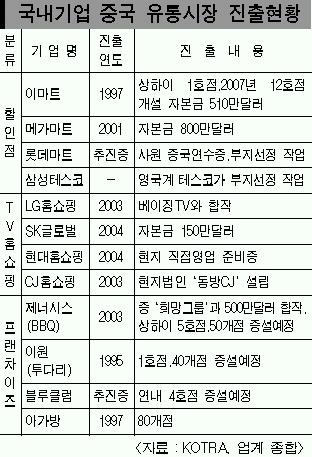 중국 진출에 유리한 업태는 대형 할인점과 전문 프랜차이즈점이다.중국의 케이블TV 가입자수가 9000만명에 이르는 만큼 TV홈쇼핑도 유리하다.TV홈쇼핑에는 국내 유명업체 4∼5곳이 이미 진출했다.