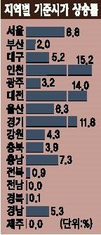 전국의 아파트와 연립주택 542만 3000가구의 기준시가가 1년 사이 평균 6.7%(873만 6000원) 올랐다.특히 인천과 대전이 각각 15.2%,14.0%나 뛰어 전국의 기준시가 상승을 주도했다.금액기준으로는 서울이 2033만원으로 가장 많이 올랐다.