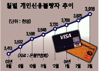 신용불량자 수가 다시 늘어난 것은 신용카드 관련 신용불량자가 2월 말의 250만 6000명에서 3월 말에 259만 1000명으로 3.38%(8만 4000명)나 증가했기 때문이다.배드뱅크 설립을 계기로 채무재조정에 대한 기대 등 모럴해저드(도덕적 해이)가 확산된 데다 지난해 연말 카드사들이 일제히 대환대출(대출을 받아 빚을 갚는 것) 심사를 강화한 데 따른 것으로 풀이된다.