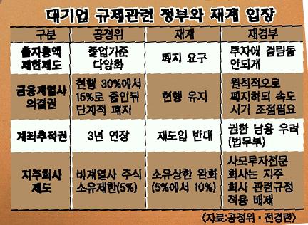 최근 당정협의에서는 의결권 행사한도를 우선 30%에서 15%로 축소하되,유예기간을 두는 것으로 가닥을 잡았으나,공정위는 유예기간을 없앴다.국회 협상용으로 여지를 남겨놓은 측면도 있다.하지만 재계는 외국자본의 적대적 인수·합병(M&A) 등에 노출된다며 의결권 행사 축소에 강력히 반발하고 있다.역차별 규제로 금융기관의 경쟁력이 약화된다는 점도 주장하고 있다.재경부는 드러내놓지는 못하지만 재계 입장을 두둔하는 편이다.사모펀드 활성화 등을 통해 국내자본의 힘을 키워야 한다는 논리다.