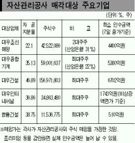 기업 인수비용은 자산관리공사가 보유주식을 지난 7일기준 종가로 인수한다고 가정하면 대우조선해양이 4400억원,대우종합기계는 5380억원,대우건설은 6702억원,쌍용건설은 510억원이 든다.비상장인 대우인터내셔널은 액면가를 기준으로 하면 1743억원이 들어간다.