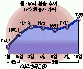 특히 이날 시장은 주가급락이 환율급등을 부추기는 악순환이 꼬리를 물고 이어졌다.서울외환시장에서 달러화는 개장 직후부터 줄곧 치솟아 지난 주말 종가보다 12원이나 오른 1183.10원에 거래를 마쳤다.특히 개장 초 전일대비 16원 가까이 뛴 1187원까지 폭등하며 지난 1월20일 이후 최고치를 기록했다.