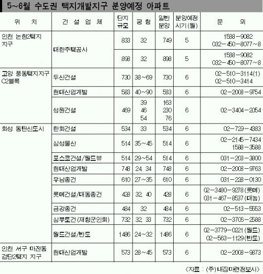 경기 화성 동탄지구와 고양 풍동지구,인천 논현지구·검단지구 등에서는 1만여가구가 공급된다.경기 남북지역인 동탄과 풍동은 노른자위 택지로 분양열기 대결이 관심을 끈다.