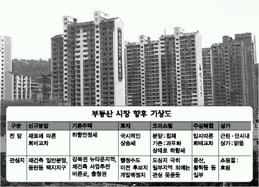 부동산 전문가들은 재건축 개발이익환수제,종합부동산세 등이 시행되면 집값 안정이 탄력을 받을 것으로 전망했다.분양시장은 주상복합아파트와 오피스텔에 대한 정부의 규제가 약효를 발휘해 ‘대박신화’는 더이상 찾기 힘들 것이라는 분석이다.대신 입지가 좋은 신규 분양 상품은 지금과 마찬가지로 높은 인기를 끌 것으로 보인다.