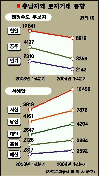 반면 신행정수도 후보지로 거론되는 공주·연기와 천안시는 거래량이 확연하게 감소했다.허가구역에 투기지역으로 지정되면서 투기꾼들이 활동을 접었기 때문으로 풀이된다.