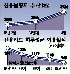 카드이용한도 축소 등으로 카드 이용액은 줄고 있는 반면 신용카드 연체자 등 신용불량자는 갈수록 늘고 있다.세금체납자와 법원 채무불이행자까지 포함하면 400만명에 육박한다는 분석이다.