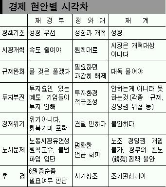 정부와 재계의 근본적인 차이점은 경제위기에 대한 진단이다.경제팀 수장인 재경부는 “안팎의 악재로 경제가 힘들어진 것은 사실이지만 위기상황은 아니다.”라고 보고 있다.이헌재(李憲宰) 부총리 겸 재경부 장관은 “미약하나마 경기가 살아나는 기미가 감지되고 있으며,이르면 2분기 말부터는 (이같은 회복기미가)가시화될 것”이라고 주장한다.
