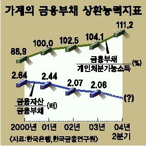 가계의 금융부채가 늘었으나 금리하락으로 2000년 10.5%에서 2002년 9.0%로 떨어지기는 했다.하지만 앞으로 금리가 오르면 그만큼 이자상환 부담이 커지게 된다.