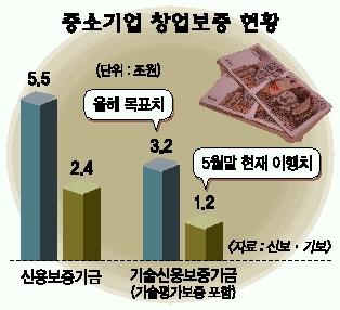 실제 5월 말 현재 양대 기금을 통해 나간 창업보증금은 3조여원(신보 2조 3700억원,기보 1조 2364억원)으로 목표치의 40% 수준에 머물고 있다.신보 관계자는 “창업보증 신청이 5월 이후에 집중되는 탓”이라면서 “그러나 창업기업이 지난해보다 15% 감소하는 등 전반적으로 창업보증 수요가 늘지 않고 있어 단순한 보증규모 확대보다는 신청자격 요건완화가 더 절실하다.”고 지적했다.
