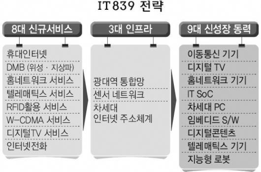 지능기반사회의 실현은 정통부가 지난 3월 추진한 ‘IT839 전략’이 토대가 된다.진 장관은 이날 ‘IT839 전략’을 집중 보고했다.