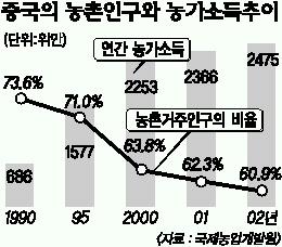 농작물 재배면적 1억 5464만㏊ 가운데 쌀,밀,옥수수 등 주요 곡물의 재배 면적은 823만㏊ 정도다.그러나 가구당 영농규모는 0.4㏊에 불과하다.소규모 영농을 하고 있는 우리나라(1.46㏊)와 비교해도 영농규모가 3분의1 수준이어서 영세농이 대부분이다.
