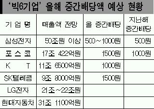 포스코의 올해 중간배당은 지난해(주당 1000원)보다 50% 늘어난 1500원이 예상된다.삼성전자도 예년과 비슷한 주당 500∼1000원의 중간배당이 전망된다.