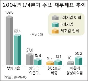 재무구조와 수익성은 크게 개선됐지만 5대기업과 그렇지 않은 기업간에,또 수출기업과 내수기업간에는 격차가 컸다.매출액 기준으로 상위 5대 기업의 부채비율(전년말 대비 70.0%→69.4%)과 차입금의존도(16.1%→15.8%)는 하락했다.
