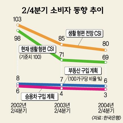 한국은행이 지난 1일부터 14일까지 전국 30개 도시 2500가구를 대상으로 조사해 23일 발표한 ‘2·4분기 소비자 동향조사 결과’에 따르면 현재의 생활형편을 6개월 전과 비교한 현재 생활형편 소비자동향지수(CSI)는 69로 2000년 4·4분기의 66 이후 3년6개월만에 가장 낮은 수준으로 떨어졌다.CSI가 100 이상이면 경기나 생활형편이 나아질 것으로 생각하는 소비자가 나빠질 것으로 보는 소비자보다 많다는 뜻이다.100 이하이면 반대를 의미한다.