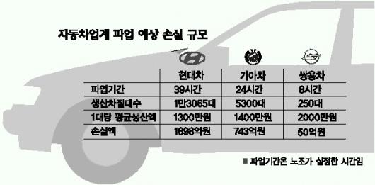 쌍용차 노조도 29일 주야 4시간씩 8시간 부분파업을 벌이게 돼 있어 250여대의 생산차질로 50여억원의 손실이 예상된다.
