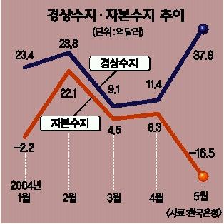 그러나 돈이 국내로 유입되거나 유출되는 거래 결과를 나타내는 자본수지는 외국인 주식투자자금의 유출과 내국인의 해외증권투자가 늘면서 16억 5000만달러의 유출초과를 기록했다.