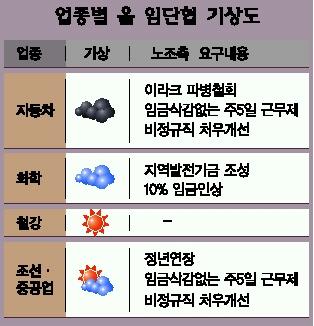 하투(夏鬪)’가 본격화되는 가운데 굴뚝업종간 ‘임단협 희비’가 엇갈리고 있다.자동차와 석유화학 업종은 주5일 근무제와 비정규직 처우 개선 등을 둘러싸고 노·사·정간 첨예한 대립 구도를 보이고 있다.여기에 이라크 추가 파병마저 주요 쟁점으로 부상,올 임단협은 그야말로 ‘산고’가 예상된다.반면 철강은 청년실업과 어려운 경제 여건을 감안해 임금동결에 적극 참여하고 있다.