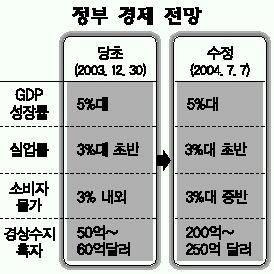 정부가 올초 전망에서 수정한 것은 물가와 경상수지 흑자규모 뿐이다.3% 안팎을 내다봤던 올해 물가상승률을 3%대 중반으로 공식 올려잡았다.그러나 이 정도의 물가부담이 올초 세웠던 성장률 전망(5%)이나 정책운용 기조(중립)를 바꿀 정도는 아니라는 입장이다.