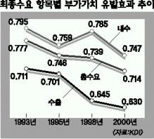 12일 한국개발연구원(KDI)이 발표한 ‘산업연관표를 이용한 수출의 부가가치 유발효과 분석’ 자료에 따르면 수출이 1원 증가할 때 국내총생산(GDP) 증가를 나타내는 수출의 부가가치 유발계수는 1993년 0.711로 최고치를 기록한 이후 지난해 0.582로 18.1% 감소한 것으로 추정됐다.10년 전 1000원어치를 수출하면 소득창출액이 711원이었는데 지난해에는 582원밖에 소득이 생겨나지 않았다는 얘기다.같은 기간 내수(소비·투자) 및 총수요에 의한 부가가치 유발계수는 각각 0.747∼0.795,0.714∼0.777 수준으로 수출보다 월등히 높았다.