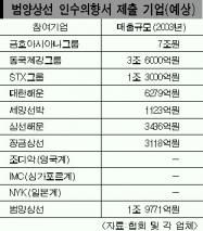 여기에는 비 해운사인 금호아시아나그룹과 동국제강그룹·STX그룹 등 3개 컨소시엄이,해운사로는 대한해운·세양선박·IMC·조디악·삼선해운·장금상선 등이 포함돼 있는 것으로 알려졌다.이외에도 시도해운·대양상선 등도 그동안 관심을 표명해 왔으나 참여여부는 확인되지 않고 있다.