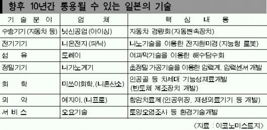 제조업체의 신기술 개발 노력은 향후 10년간 먹고 살 수 있는 경쟁력 확보로 이어졌다.일본이 앞으로 10년 동안 세계시장을 석권할 가능성이 높은 분야는 자동차·전기기기·섬유·정밀기기·화학·의약·서비스(환경관련 기술개발) 등 7개 업종이 꼽힌다.