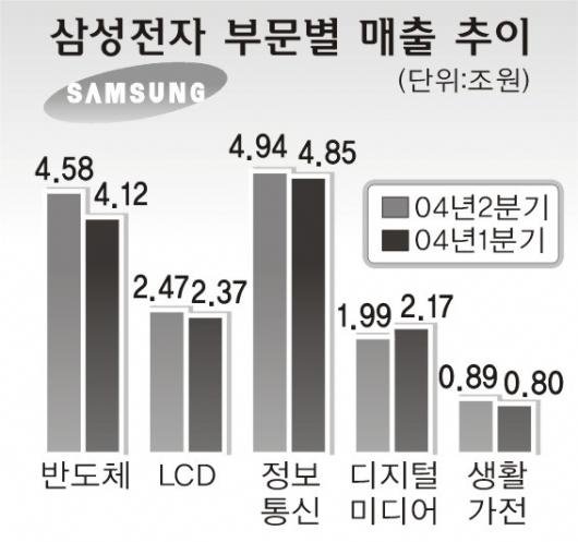 이같은 지적에 대해 삼성전자측은 “반도체의 영업이 ‘지나치게’ 좋아 비중이 높아진 것이지 다른 부문의 수익이 나빠진 것은 아니다.”고 반박했다.실제 정보통신,LCD의 영업이익은 1·4분기에 비해서는 줄었지만 지난해 같은 기간에 비해서는 각각 2500억원,6900억원이나 늘어났다.
