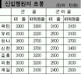 우리은행의 군필자와 군미필자 초봉은 각각 3100만원과 2500만원으로 600만원의 차이가 났다.이어 외환은행(3000만원·2500만원)과 제일은행(2900만원·2400만원)은 500만원씩,국민은행(3300만원·3100만원)과 조흥은행(3100만원·2900만원)도 200만원씩 차이가 났다.군필자와 군미필자 행원의 초봉이 같은 곳은 하나은행(3600만원)뿐이다.