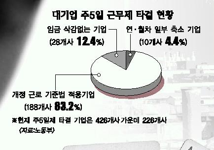 그러나 노조의 임금 삭감없는 주5일제 주장에 밀려 굴뚝업종에서는 지난해 개정된 근로기준법이 사실상 ‘있으나 마나’한 실정이다.물론 법은 개별 사업장의 특성에 맞게 노사협상으로 주5일제를 실시하도록 해 큰 문제는 아니다.그러나 굴뚝산업에 변형 주5일제가 많다는 것은 눈여겨 볼 대목이다.